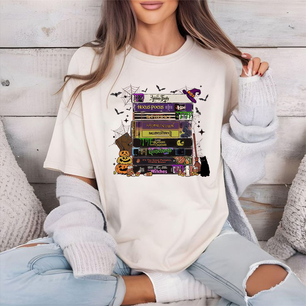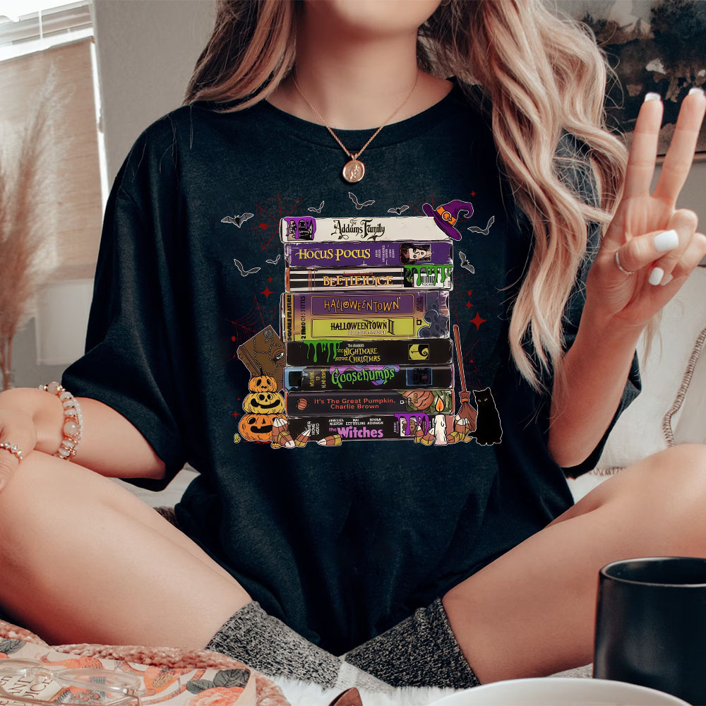 Retro Halloween VHS Tape Shirt, Spooky Movie Night Graphic Tee, Vintage Horror Film Stack T-shirt, 90s Halloween Movie Lover Sweatshirt