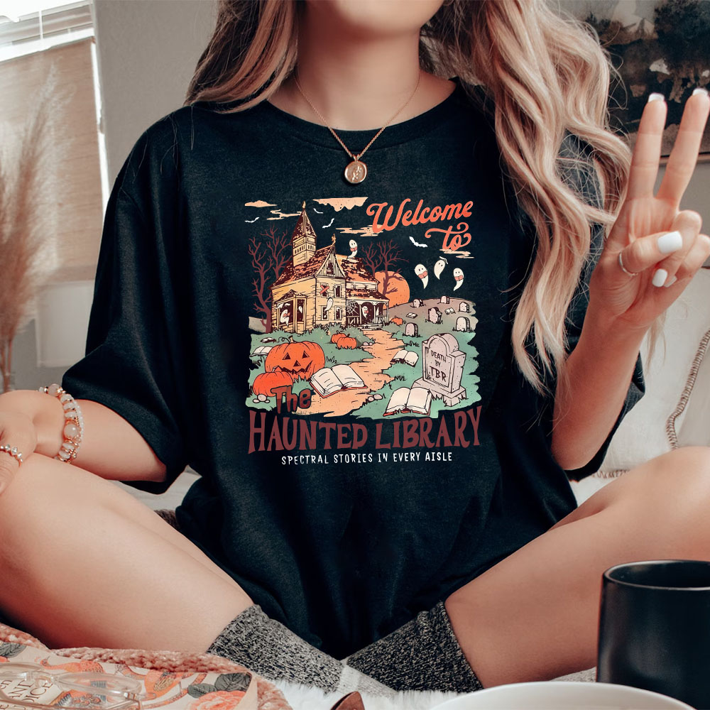 HAUNTED LIBRARY Comfort T-Shirt Cotton Top Halloween Hoodie, Trendy Funny Halloween Gift Sweatshirt