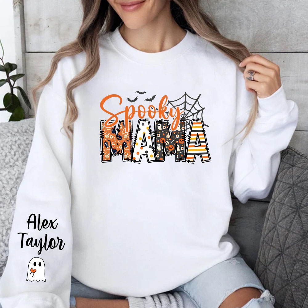 Custom Halloween Spooky Mama Sweatshirt with Kids Name on Sleeve Sweatshirt, Cool Mama Halloween Sweatshirt, Mama Halloween Gift,Custom Mama