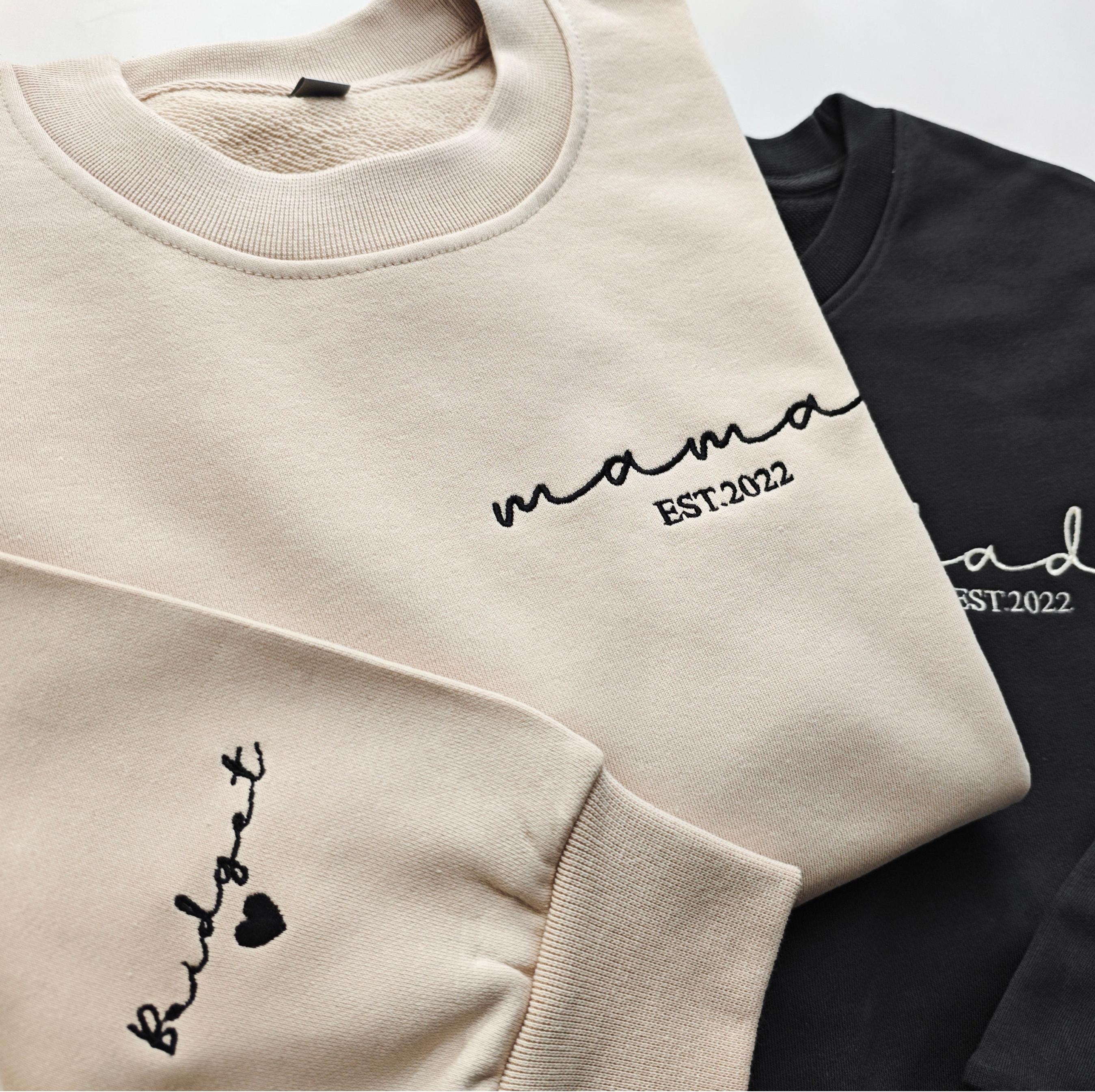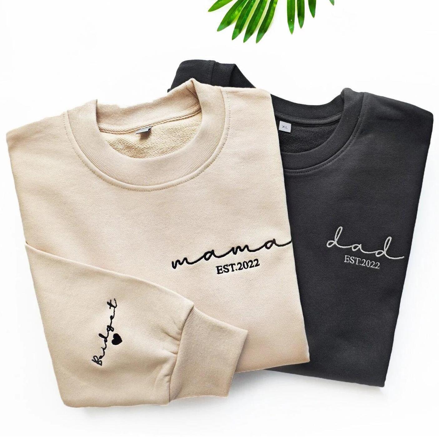 Customized Mama,Dad(Grandpa, grandma) Embroidered Sweatshirt with Date and Name on Sleeve,Gift for New Mom and Dad